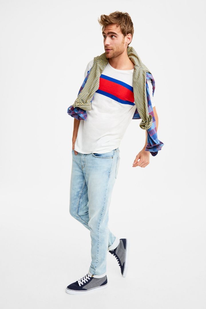 Một phom quần quá rộng sẽ khiến người nhìn liên tưởng ngay đến việc bạn vừa “thó” một chiếc quần từ tủ đồ của bố, vì thế hãy lựa chọn cho mình dáng quần slim-fit. Chỉ cần phối với một chiếc áo thun basic hoặc áo sơ-mi flannel là đã thể hiện được một hình ảnh trẻ trung, năng động. Chơi đùa thêm chút nữa với một đôi bốt (chẳng hạn như Chelsea boots hay Chukka) sẽ nâng cấp bạn lên thành một urban chic chính hiệu. Nếu yêu thích phong cách retro, bạn hãy kết hợp cùng áo phông họa tiết cổ điển, những chiếc áo sơ mi kẻ sọc và những chiếc áo bomber và áo thun đầy màu sắc.